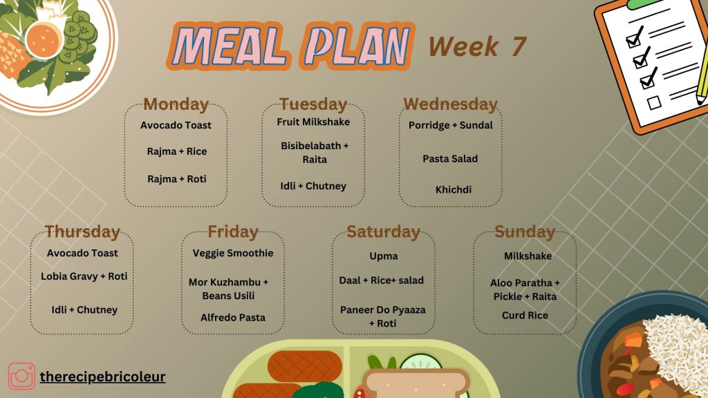 This week’s plan has a good mix of everyday staples like Rajma Chawal, Bisibelebath, and Khichdi, along with some fun additions like Pasta Salad and Pasta Alfredo. Mornings are easy with milkshakes, idli, and toast, while dinners are cozy and filling. Hoping this plan makes cooking stress-free while keeping meals delicious!